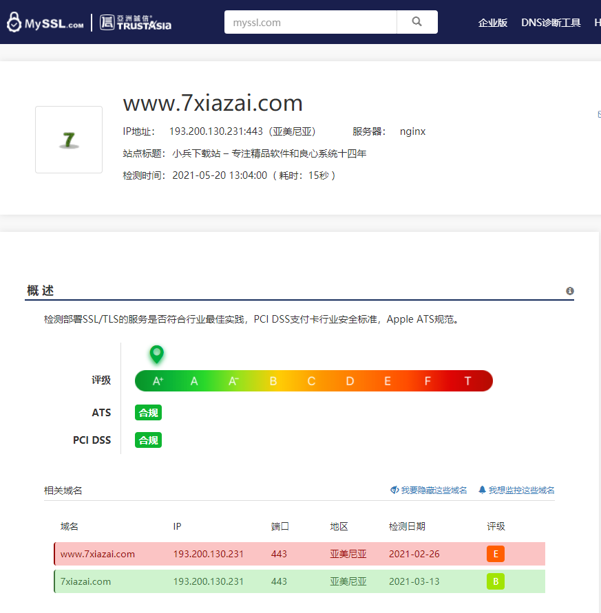 在查看文章“宝塔面板开启支持SSL1.3及SSL的配置教程”中,文章中多次提到“A+评分”及https://myssl.com/ 这个网站,于是打开检测,发现我的SSL评级是B,而且曾经是E!