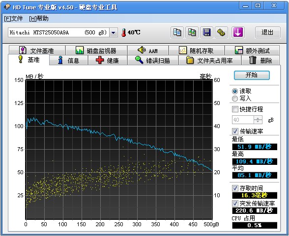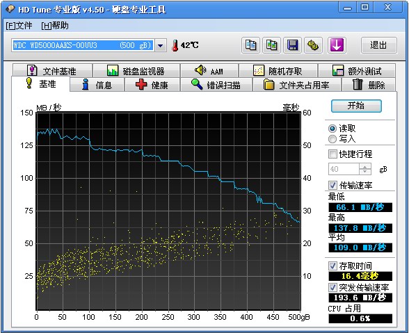 这是台式机上面的WD500G/7200,外圈有130M的速度,前350G都有100M的读取,但是突发没有小盘猛啊。