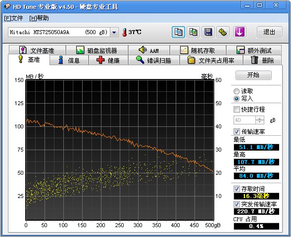这是我的本子上面的WD320G/5400硬盘的HDTUNE测试图片,最高速度约60,平均50上下。